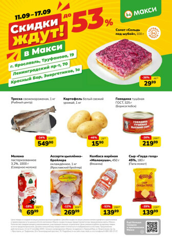. Мы опубликовали акцию Скидки ждут! (скидка предоставляется при наличии карты "Макси"), действие которой начинается 11 Сентября и заканчивается 17 Сентября. Поэтому если Вы житель города Ярославль либо же его гость, детальненько изучите данные предложения. Вполне возможно, здесь есть именно те скидки в супермаркетах, что Вы так давно и безутешно искали. Вооружитесь знаниями и вперед в ближайший к Вам магазин на шопинг! Только будьте бдительны и внимательно смотрите на дату, вдруг акция уже закончилась или еще не началась.